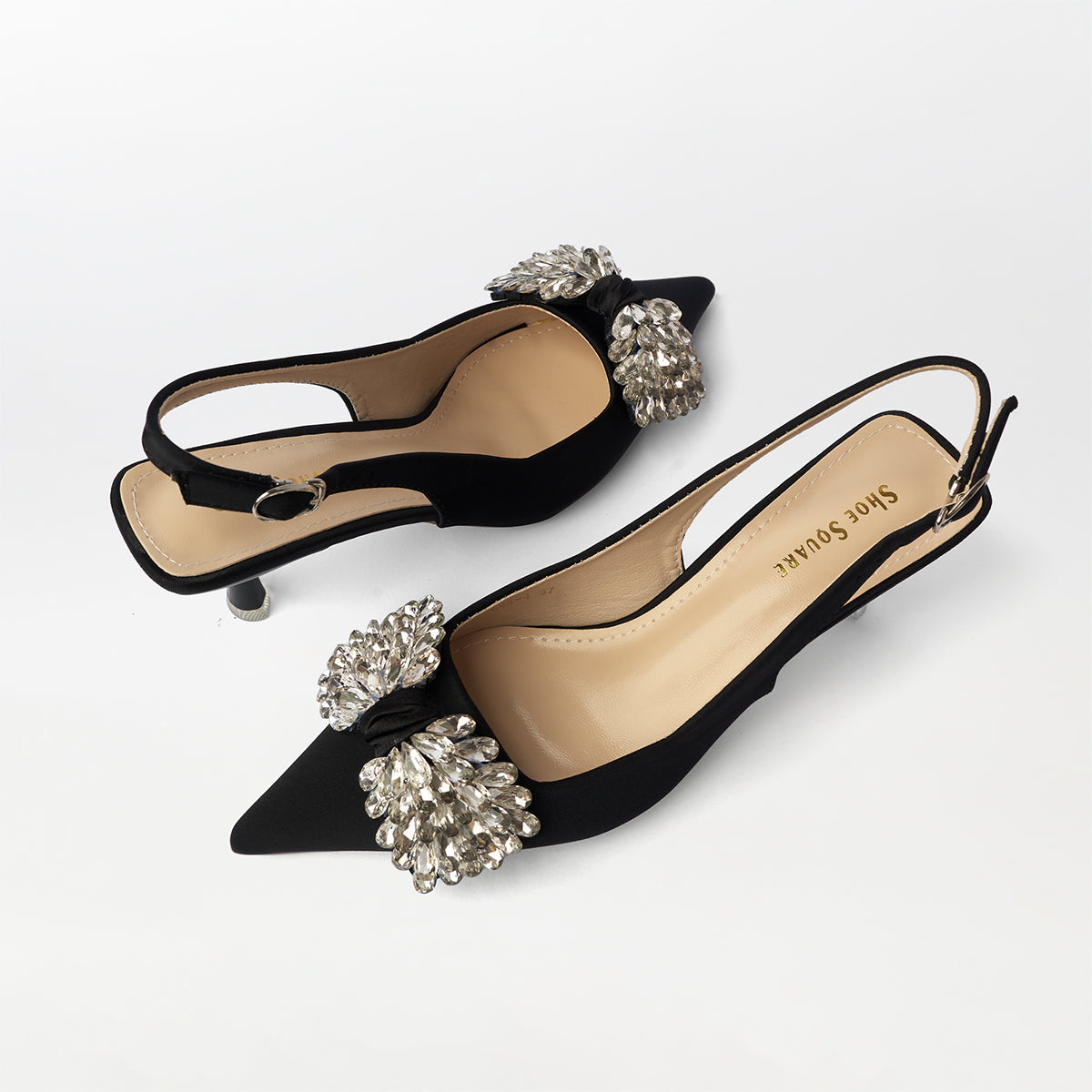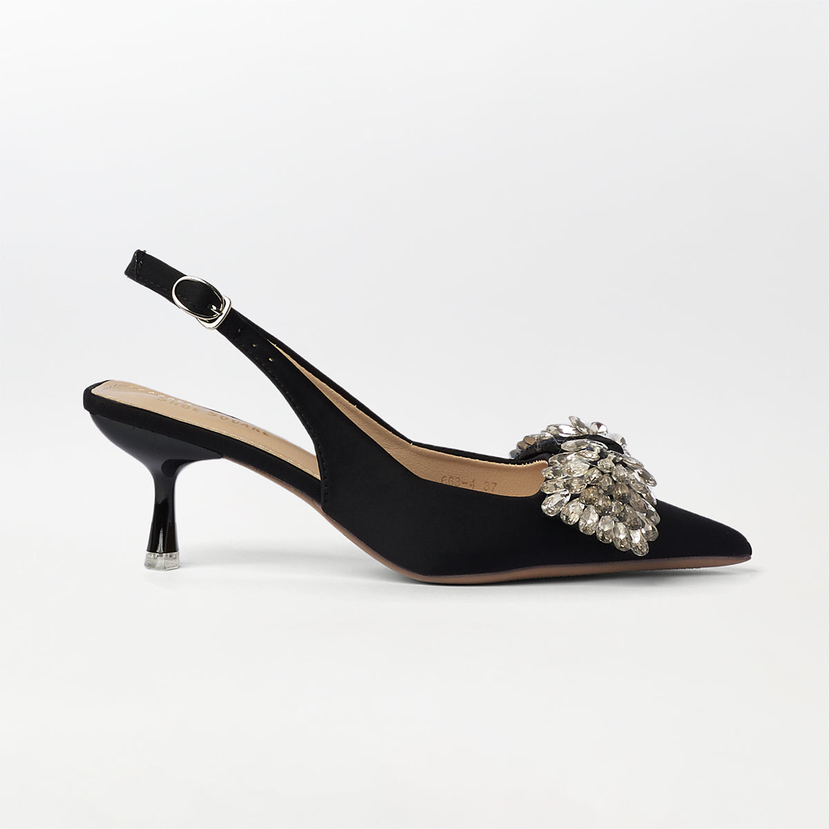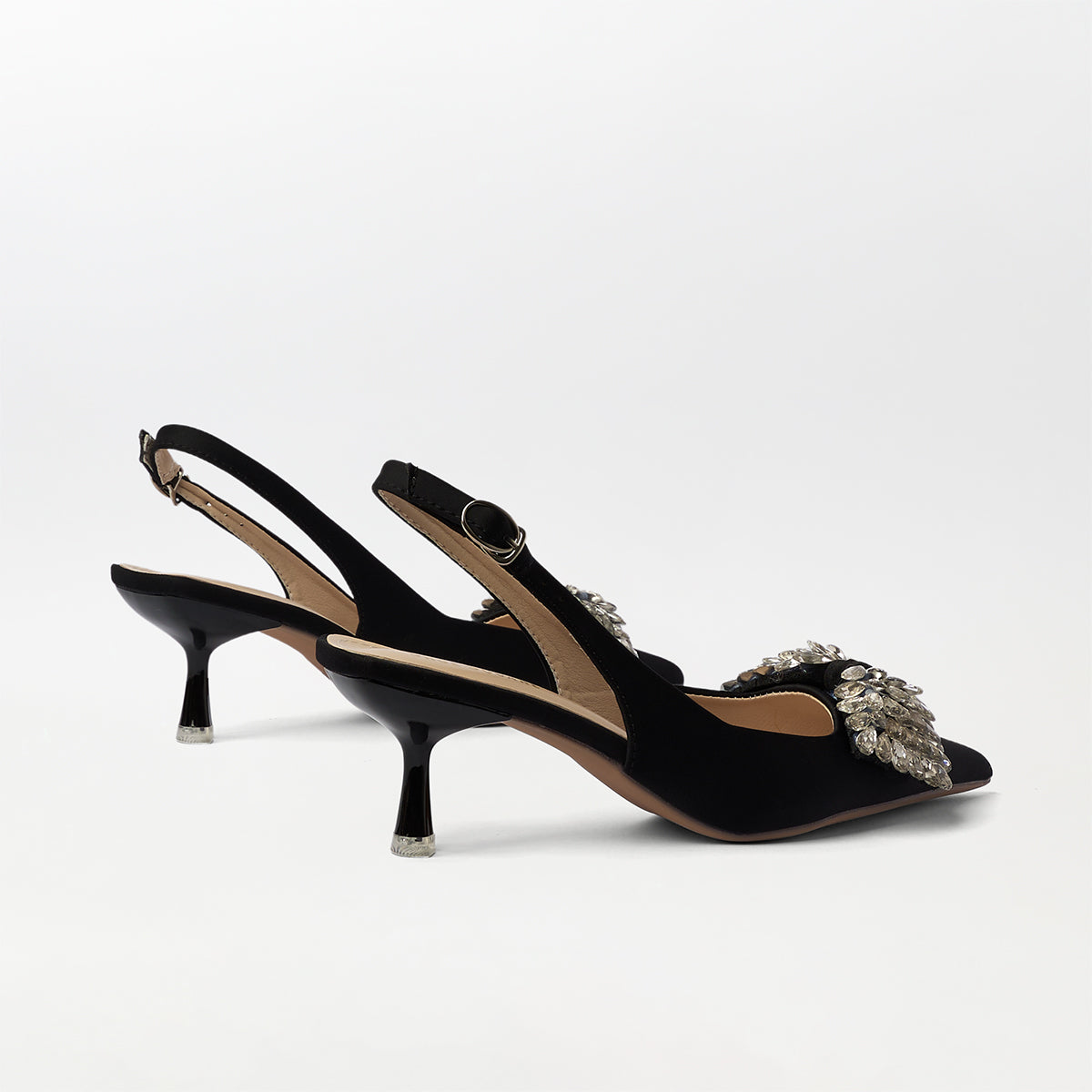 Elevate your evening ensemble with this sophisticated sling back heel, distinguished by its striking broach embellishment. The sleek black silhouette offers timeless versatility, while the ornamental broach detail adds an unexpected touch of glamour and refinement. Designed for those who appreciate understated luxury, this shoe seamlessly transitions from formal occasions to upscale social events. The sling back construction ensures a secure, comfortable fit throughout the day. A refined choice for the discerning shopper seeking both style and substance.