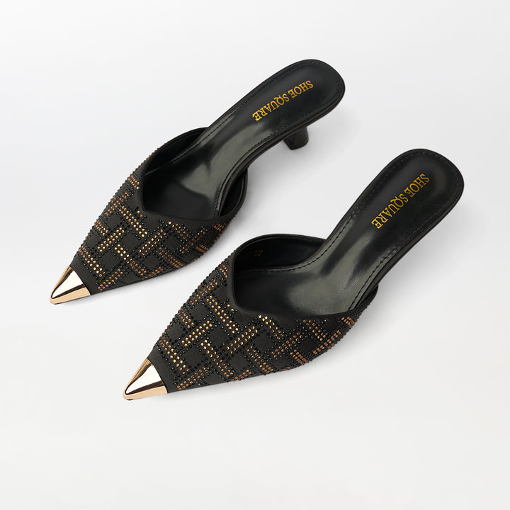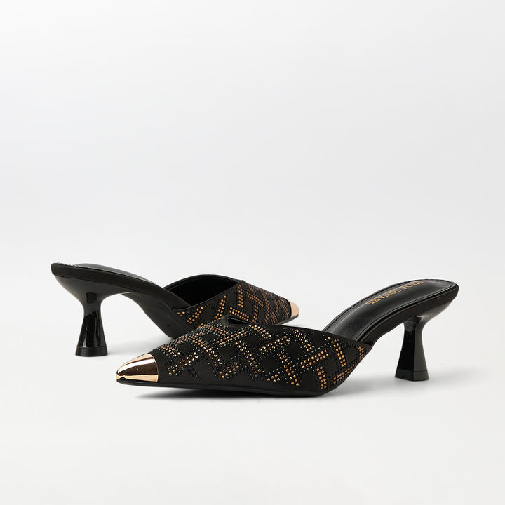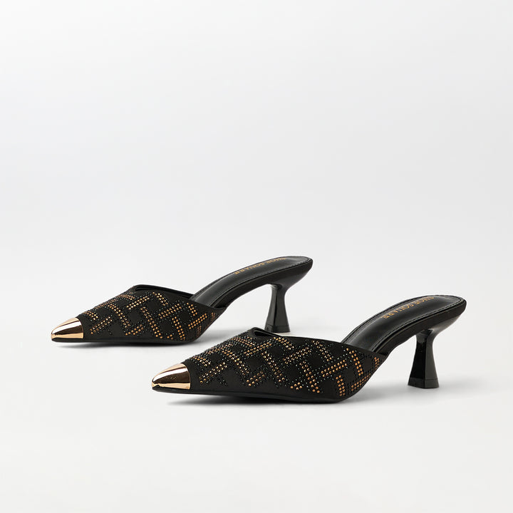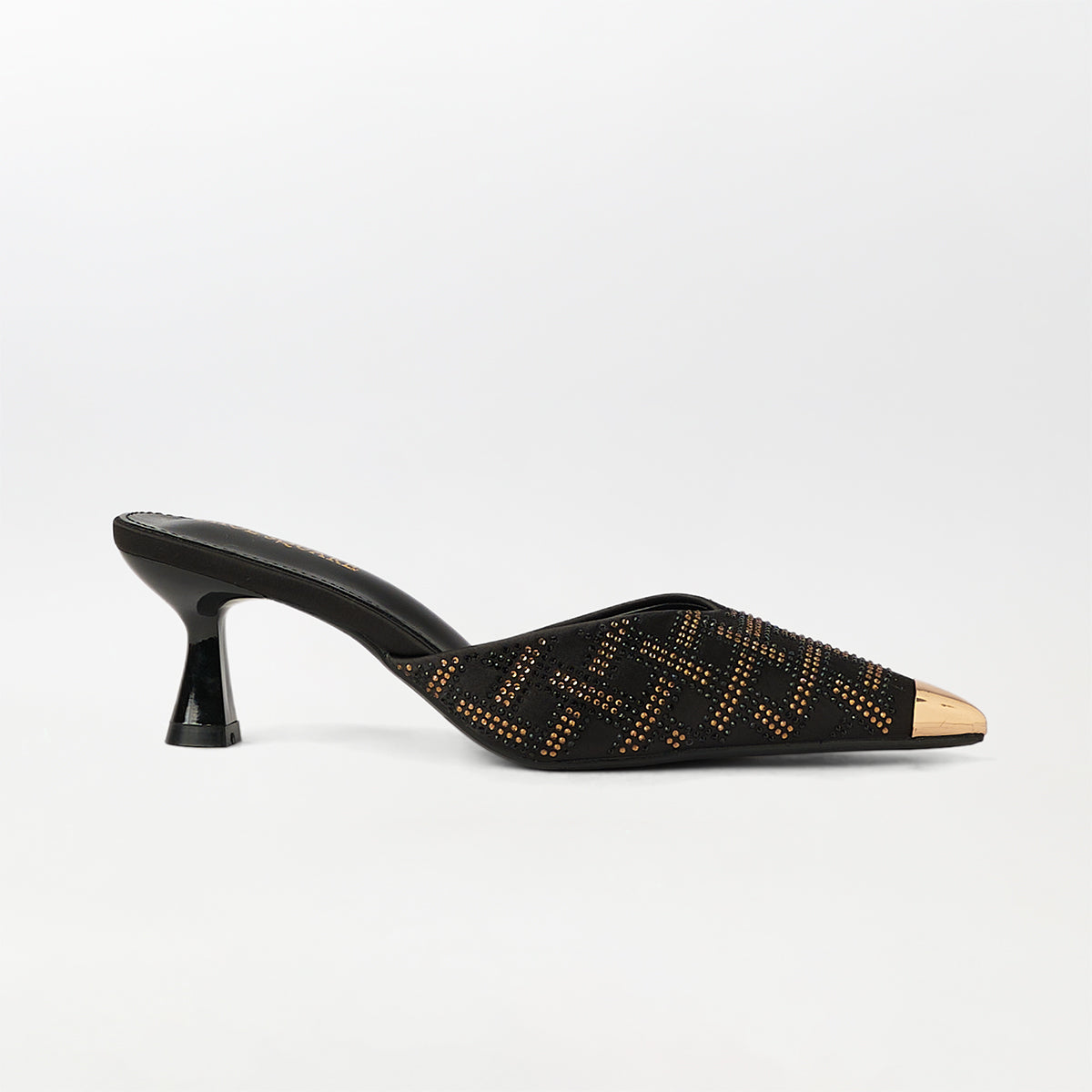 Elevate your footwear collection with these Embellished Kitten Heel Mules in black. Featuring a graceful low heel for comfortable wear and subtle embellishments that add a refined touch, they seamlessly blend style with sophistication. Perfect for both professional settings and elegant evenings, these mules offer versatile charm and expert craftsmanship.