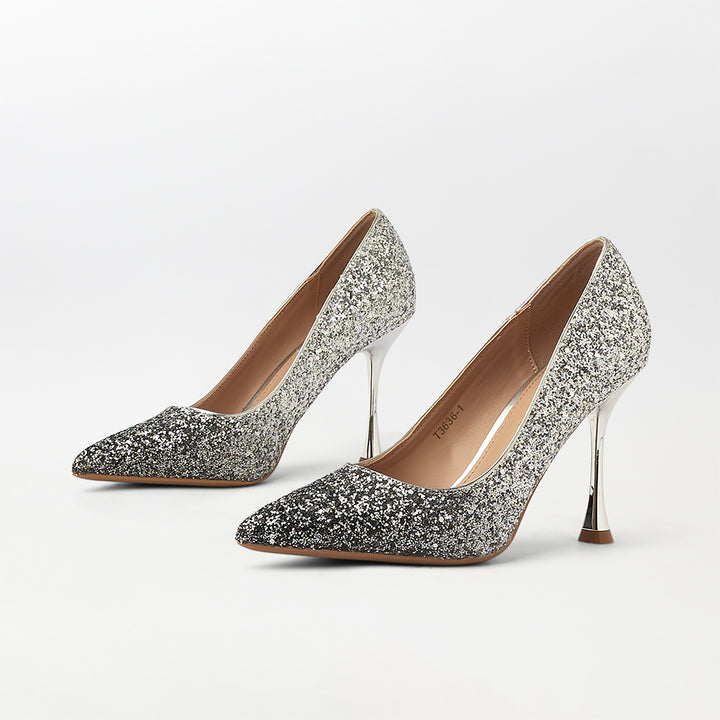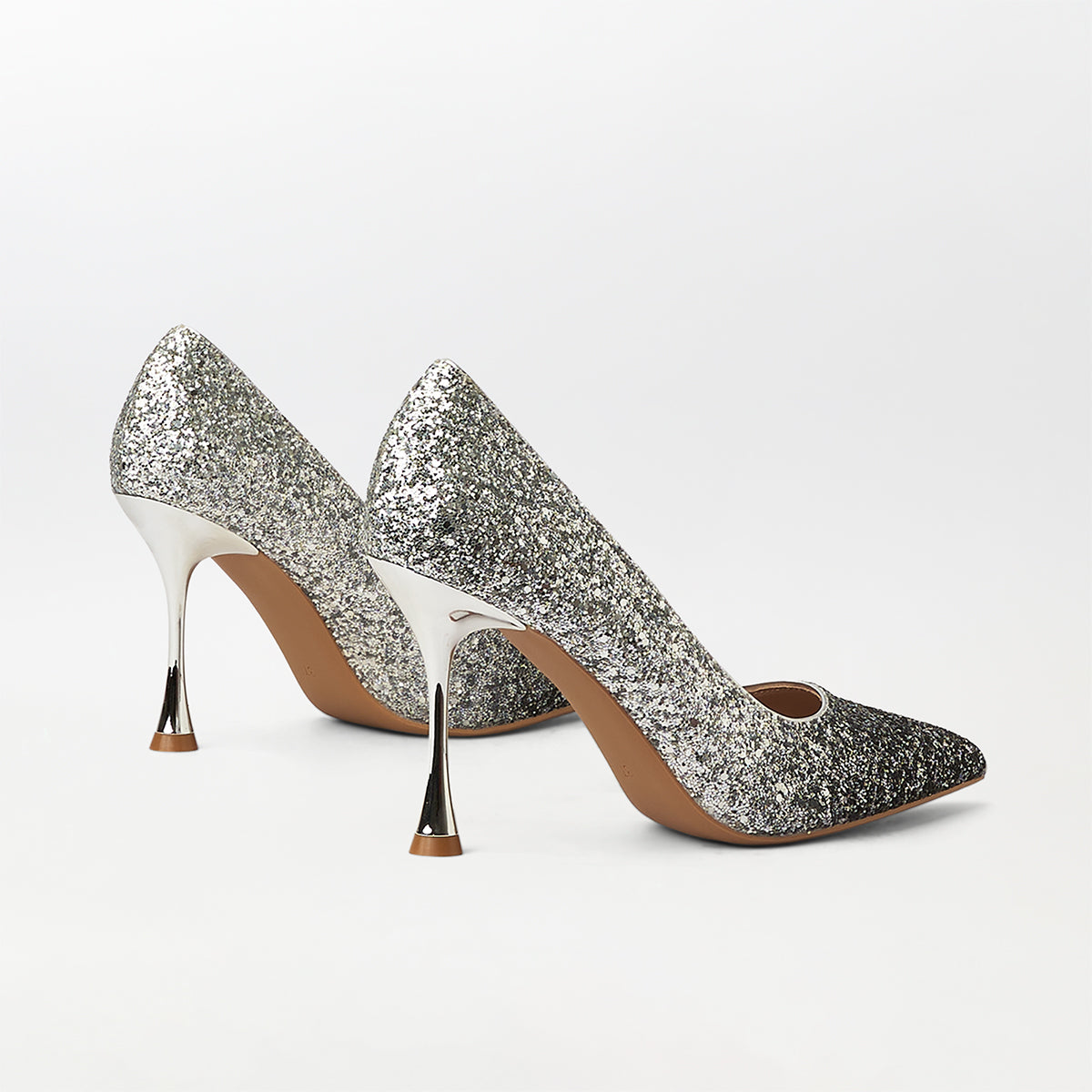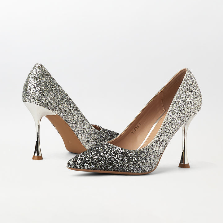 Step confidently with the Two Tone Glitter Stiletto High Heels in silver, designed to elevate your elegance. These heels feature a striking two-tone glitter finish that catches light from every angle, adding a sophisticated sparkle to any outfit. The finely crafted stiletto heel offers a sleek silhouette and height, perfect for formal events or stylish evenings out. Experience a blend of glamour and expert craftsmanship that ensures both standout style and enduring quality.