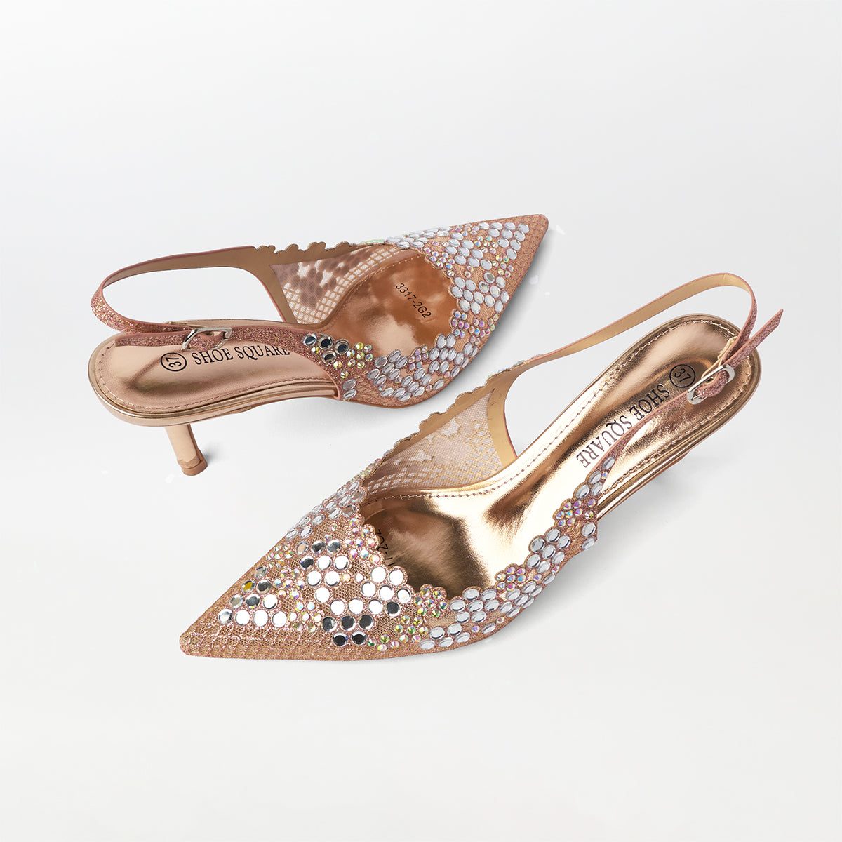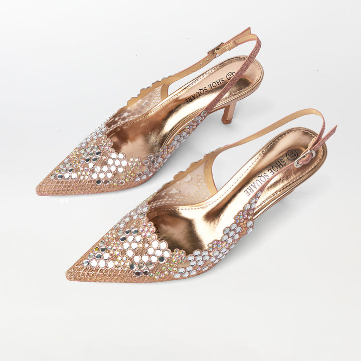 Mirror Embellished Slingback Kitten Heels Champagne - (CH274)