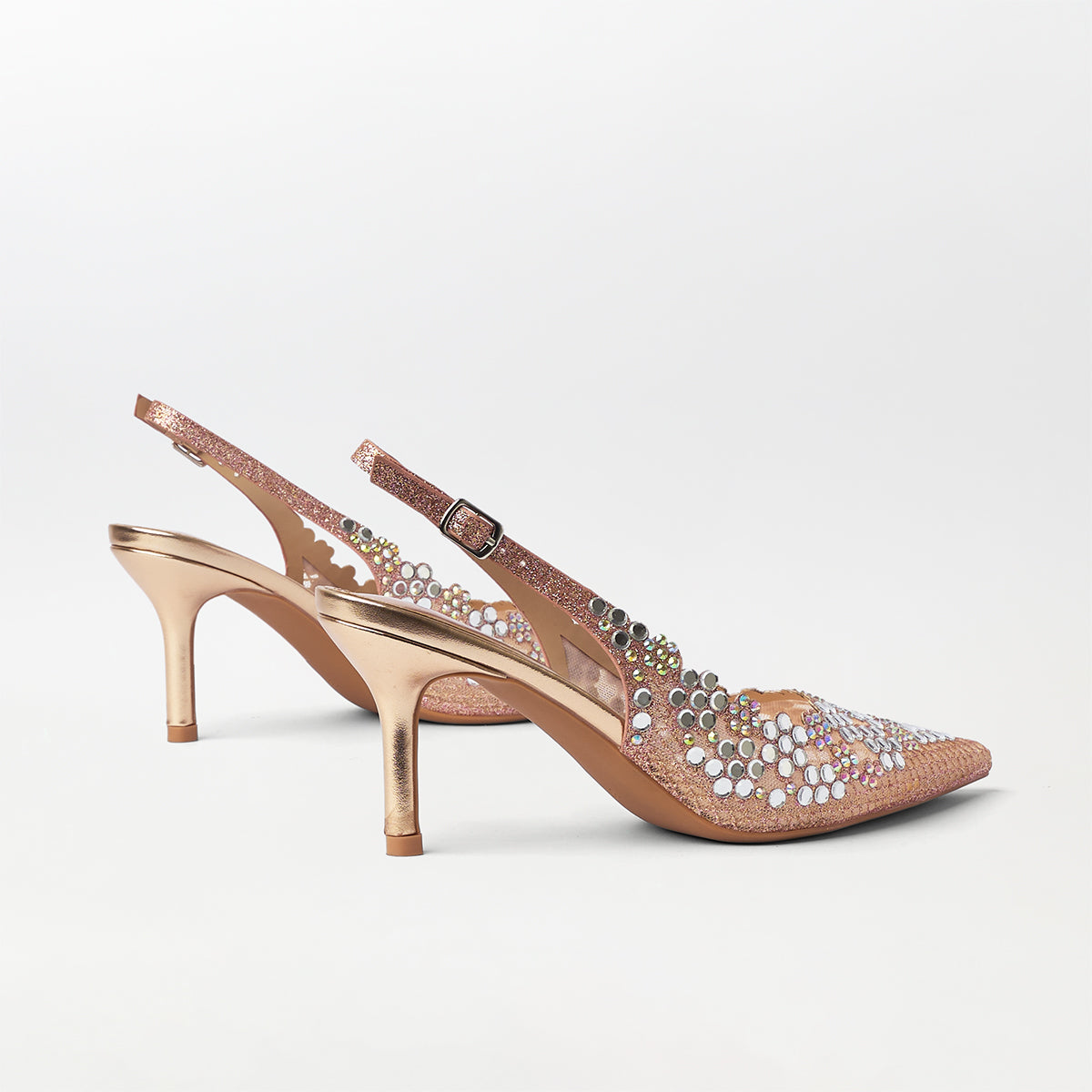 Elevate your ensemble with these Mirror Embellished Slingback Kitten Heels in Champagne. Featuring a refined kitten heel for comfortable wear, the slingback design ensures a secure fit while adding elegance. The sparkling mirror embellishments catch the light beautifully, making these heels an exquisite choice for formal occasions or stylish evenings out. Crafted in a delicate champagne shade, they provide versatile sophistication to complement a variety of outfits.