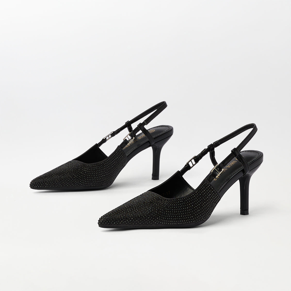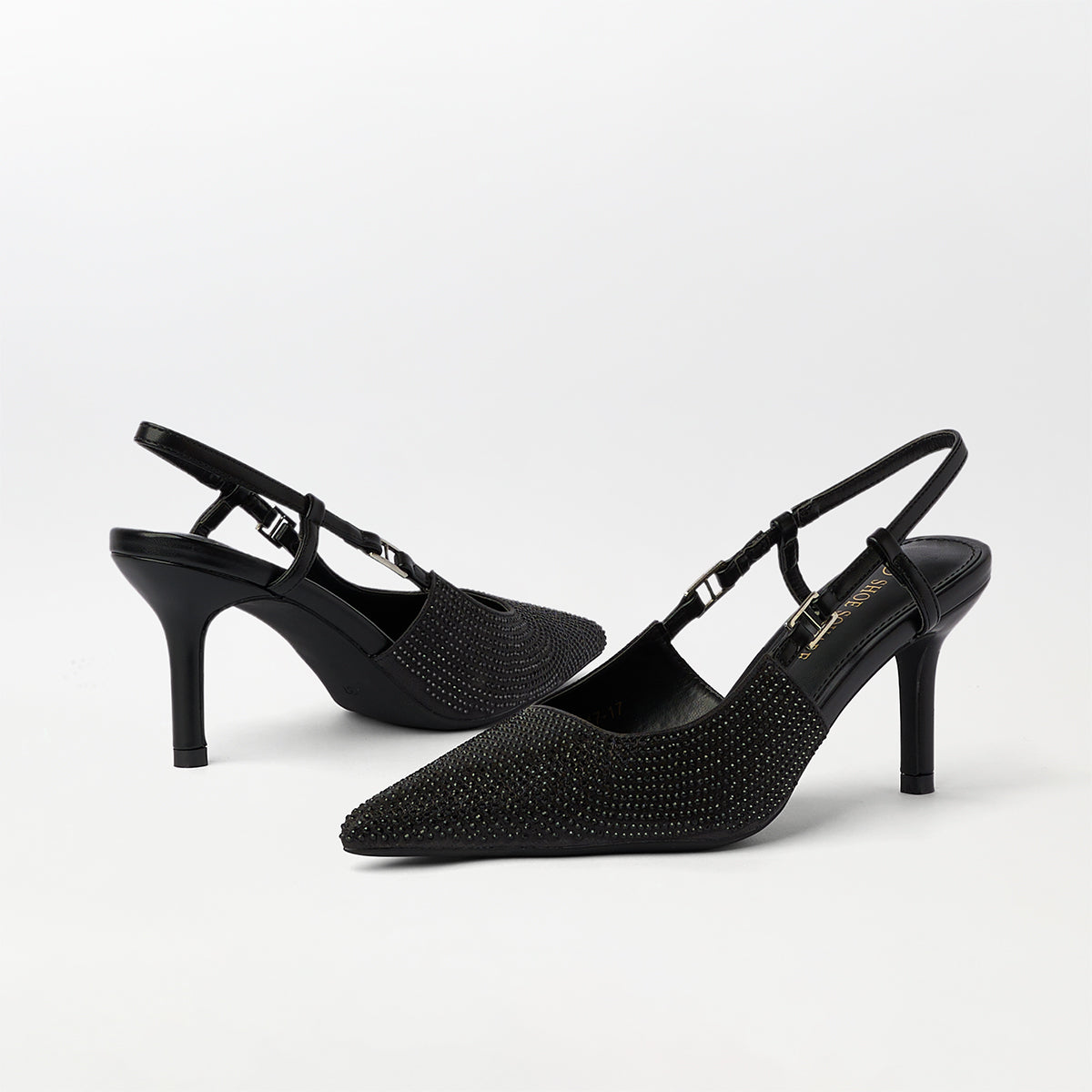 Elevate your ensemble with these Embellished Slingback Kitten Heels in black. Designed for both style and comfort, they feature a refined kitten heel and delicate embellishments that add a subtle yet sophisticated sparkle. The slingback strap ensures a secure fit, making these heels ideal for extended wear at formal events or upscale occasions. Their sleek silhouette effortlessly complements a variety of outfits, enhancing your look with expert craftsmanship and timeless elegance.