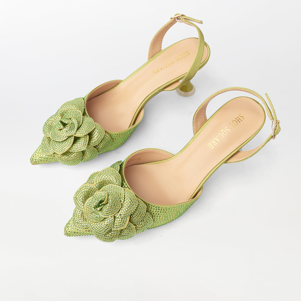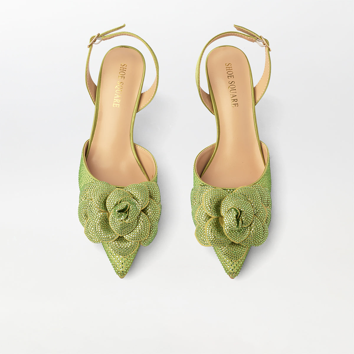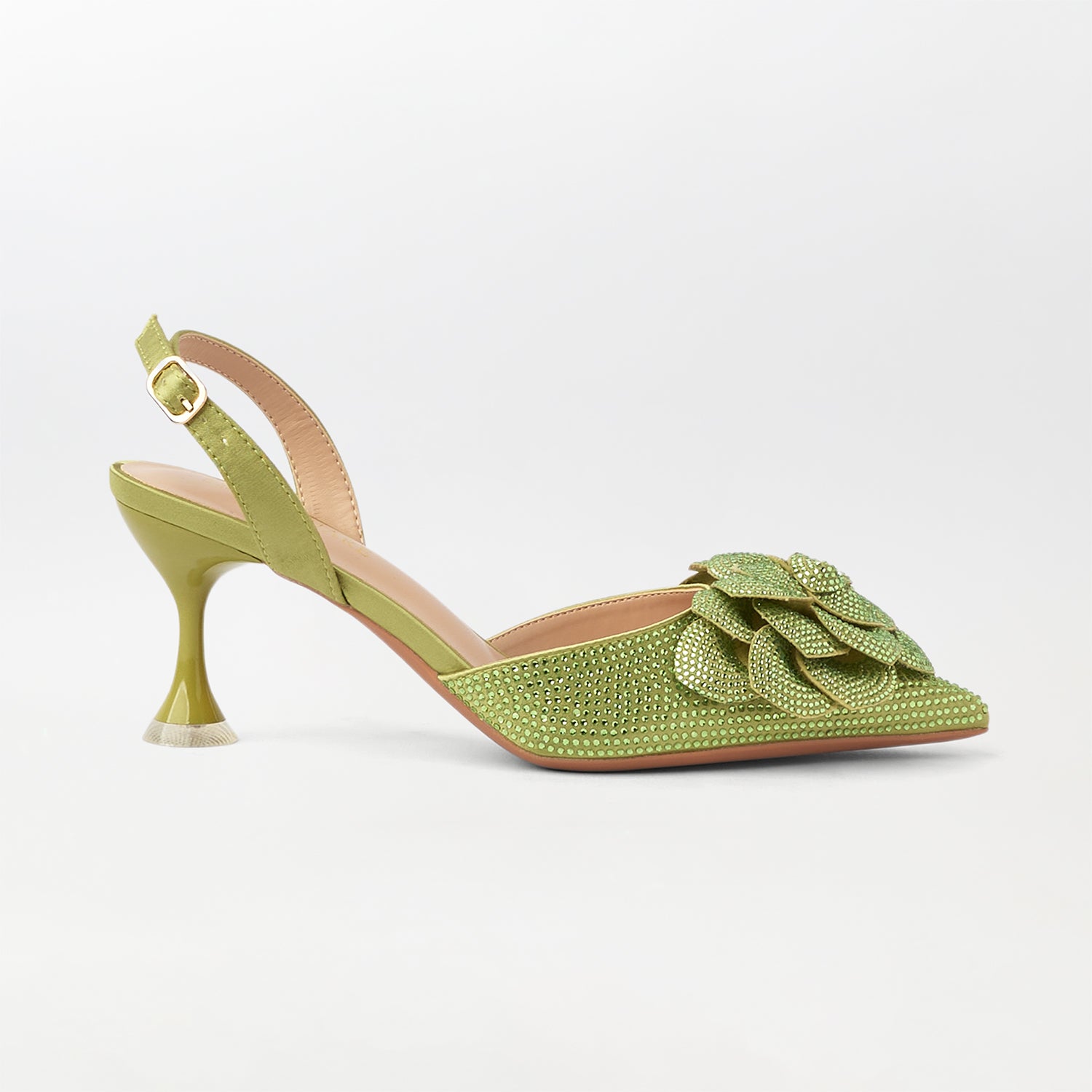Elevate your everyday elegance with these embellished kitten heel sandals in a sophisticated green shade. Designed for the modern woman who values both comfort and style, the modest kitten heel provides all-day wearability without sacrificing polish. Intricate embellishments add a touch of refinement, making these versatile enough for casual outings or semi-formal occasions. The green hue complements a variety of wardrobes while maintaining a timeless appeal. Perfect for those seeking a refined footwear option that balances practicality with understated glamour.