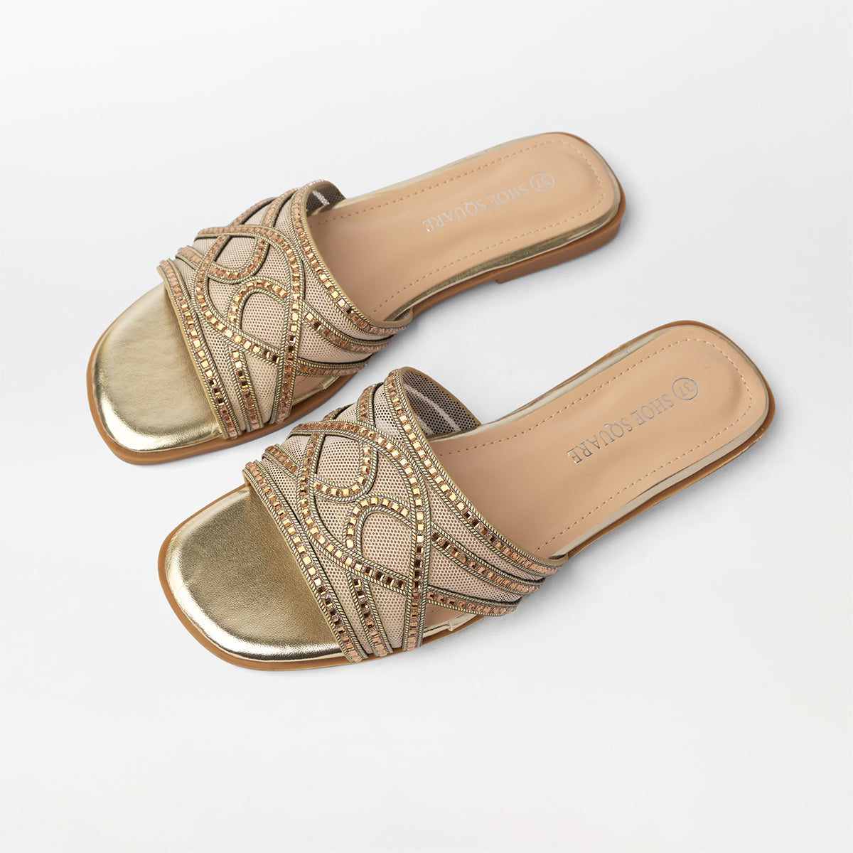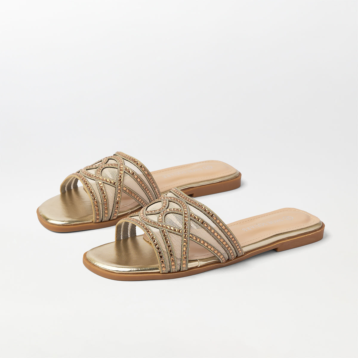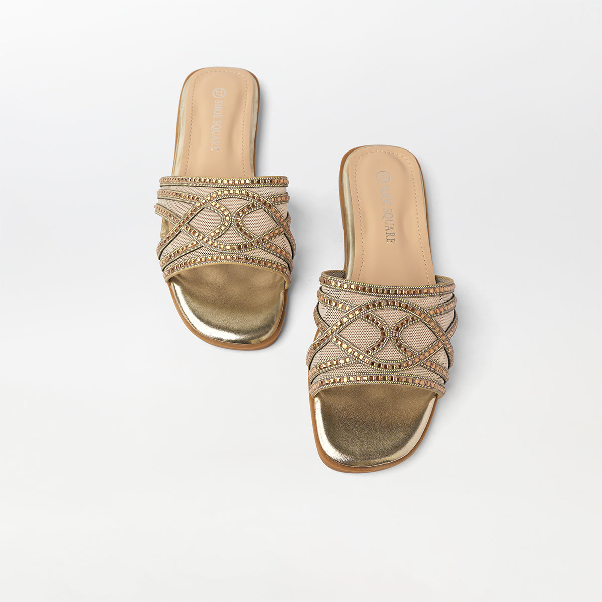 Elevate your everyday comfort with these exquisitely crafted flat slippers featuring intricate cut work design and shimmering rhinestone embellishments. The golden finish adds a touch of sophistication, making them perfect for both casual lounging and entertaining guests. Meticulously designed with attention to detail, these slippers combine traditional artistry with modern comfort. The lightweight construction ensures all-day wearability, while the elegant embellishments make a subtle style statement. Ideal for those who appreciate quality craftsmanship and refined aesthetics in their footwear collection.
