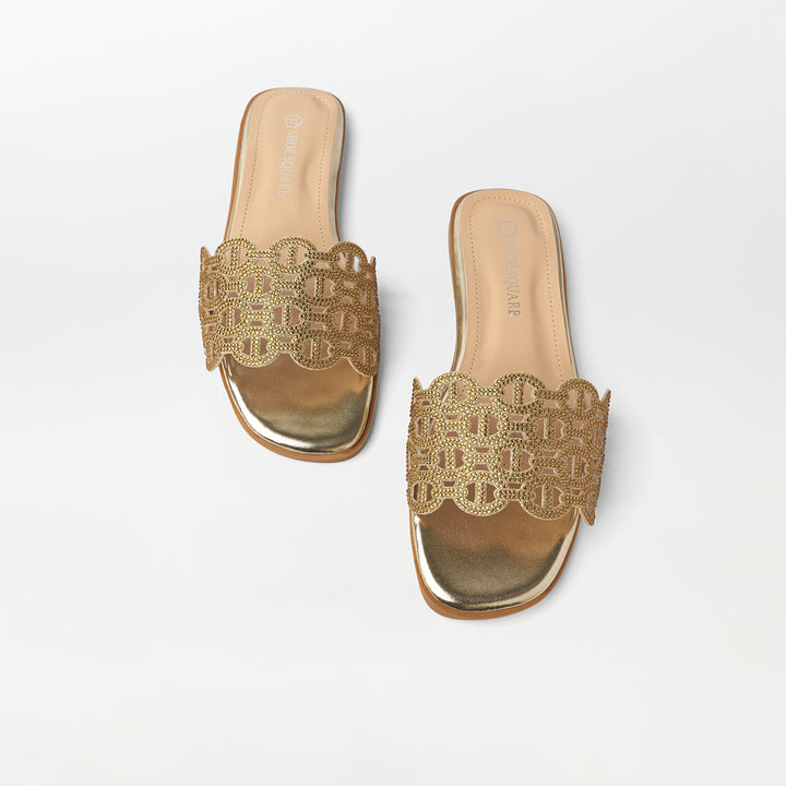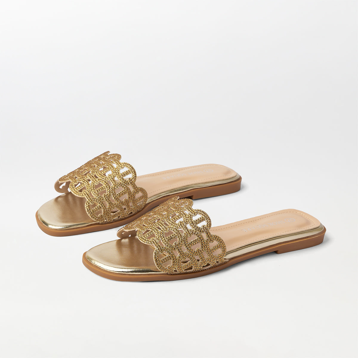 Elevate your everyday comfort with these exquisitely crafted flat slippers featuring intricate cut work embellishments in lustrous gold. Meticulously designed for those who appreciate refined details, these slippers combine traditional artisanal craftsmanship with contemporary style. The delicate cut work patterns showcase skilled handiwork, while the flat sole ensures effortless wearability for indoor lounging or casual outings. Perfect for adding a touch of elegance to your home collection, these slippers deliver both aesthetic appeal and practical comfort. An ideal choice for discerning customers seeking quality footwear that doesn't compromise on style.