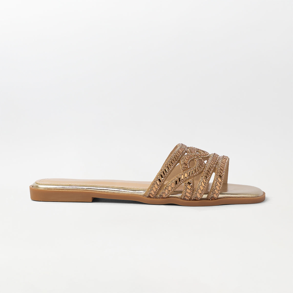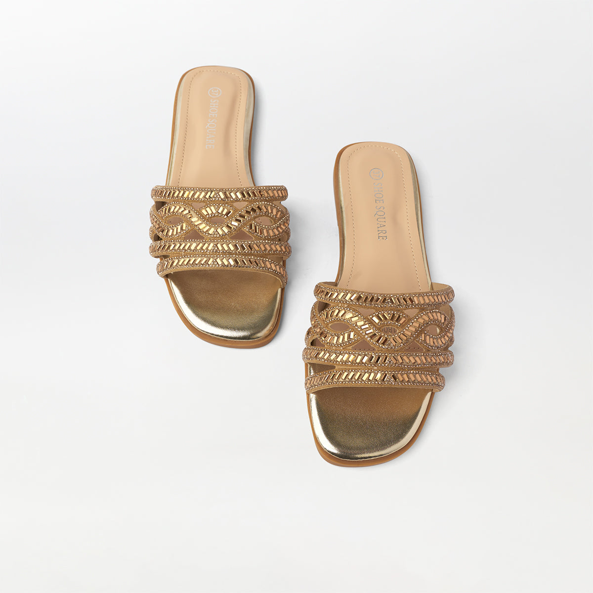 Elevate your everyday comfort with these sophisticated flat slippers, adorned with intricate stone embellishments in a luxurious gold finish. Crafted for those who refuse to compromise on style, these slippers feature a cushioned footbed that provides gentle support throughout the day. The flat design ensures effortless wearability, making them ideal for lounging at home or casual indoor gatherings. Premium materials and expert craftsmanship deliver durability alongside elegance. Perfect for adding a touch of refined glamour to your relaxation routine.